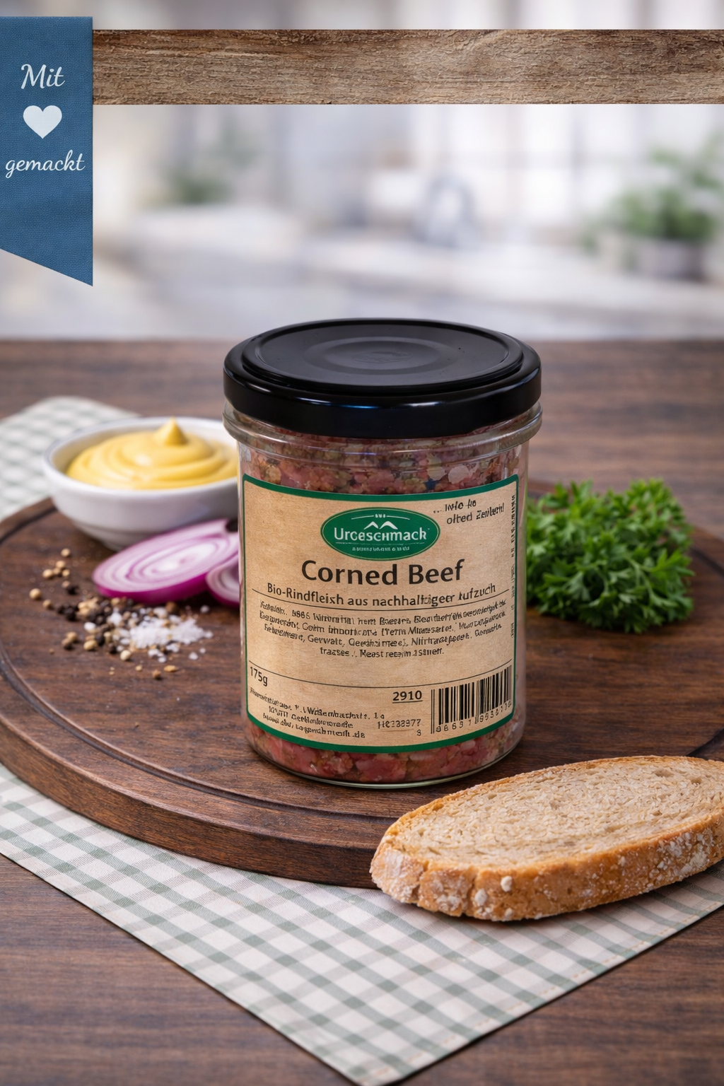 Unser Corned Beef wird aus magerem Rindfleisch vom Aberdeen-Angus hergestellt – sorgfältig vorgekocht in einer selbst angesetzten Gemüsebrühe und anschließend mit einer feinen Gewürznote eingekocht. Das Ergebnis: Zart, aromatisch und typisch „Hausmacher“, ohne Zusatzstoffe und mit dem ehrlichen Geschmack guter Zutaten.