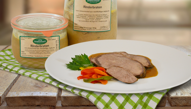 Der-Urgeschmack... Rinderbraten aus Omas guter KücheEin echter Klassiker für den Sonntagstisch: Unser Rinderbraten vom Aberdeen Angus Rind aus artgerechter Haltung wird sorgfältig angebraten und anschließend schonend gegart. So bleibt das Fleisch wunderbar zart und entwickelt ein kräftiges, vollmundiges Aroma – ganz wie früher bei Oma, nur ohne Brühwürfel und ohne Tricks.Serviervorschlag: Perfekt mit Rotkohl und Klößen.Zutaten: Rindfleisch (Betrieb Jedenak – Klostergut Burgwalde), Trinkwasser, Zwiebeln, Rotwein*, Sahne*, Tomaten*, Gemüse*, Maisstärke.Enthält: Lauch*, Senf*, Laktose*, Sellerie*.* aus nachhaltigem Anbau.Der-Urgeschmack – ehrlich gekocht, traditionell genossen.