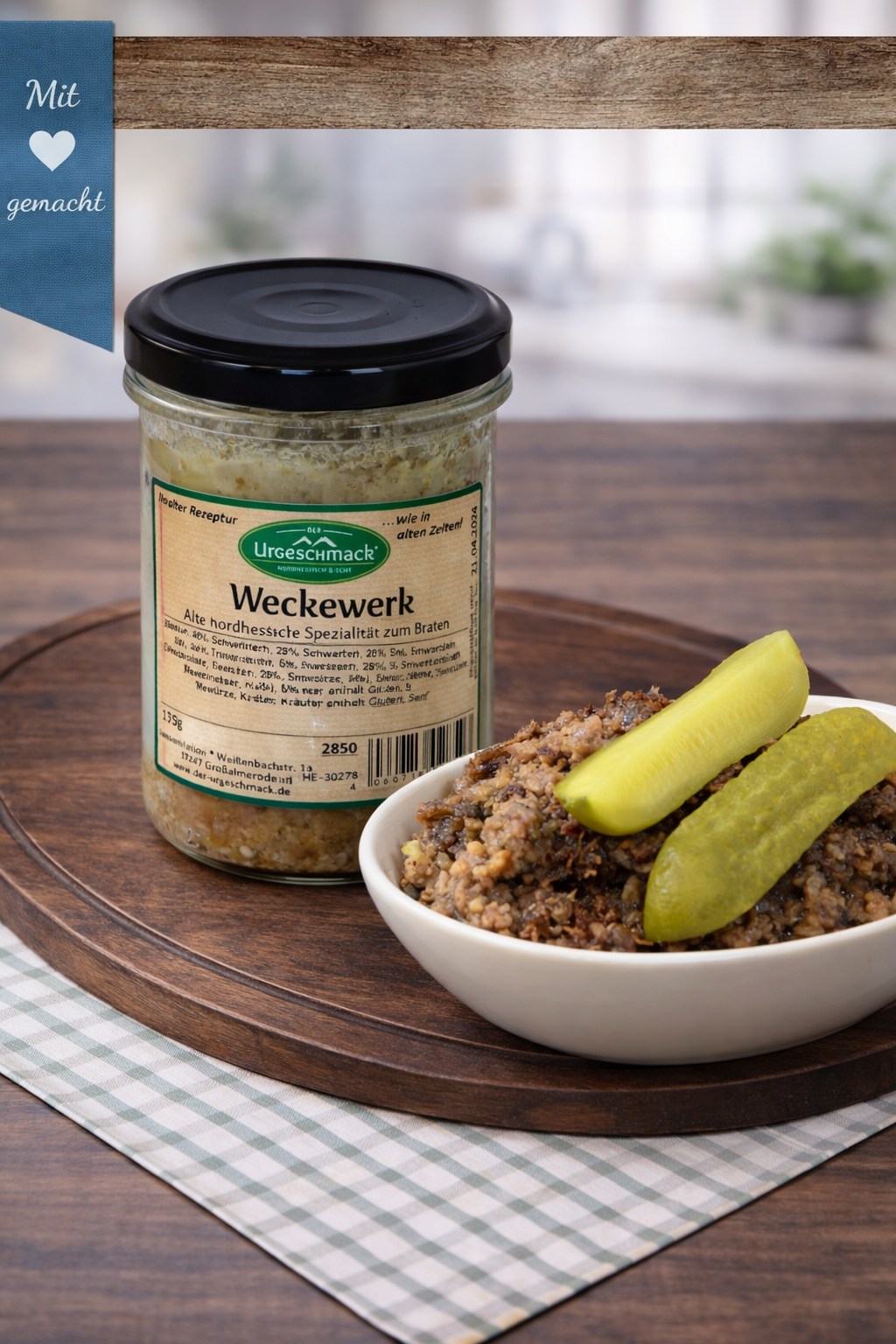 Mit seinem hohen Hackfleischanteil hebt sich unser Weckewerk deutlich von vielen anderen ab – kräftig im Geschmack, ehrlich in der Herstellung und mittlerweile eine echte Delikatesse. Hergestellt aus Hackfleisch, Schwarten, Brötchen (Wecke) und Zwiebeln, pikant gewürzt und durch den Wolf gelassen, steht es für gelebte nordhessische Esskultur.